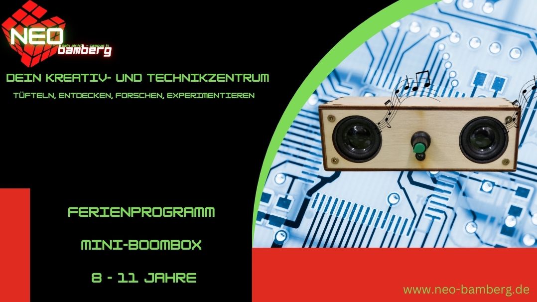 In diesem Workshop baust du dir deine eigene Mini-Boombox! Zu erst leimst du das Holzgehäuse zusammen, danach baust du die elektronischen Teile wie den Stereoverstärker, den Bluetooth-Empfänger und den Lithium-Ionen-Akku ein. Du lernst, wie man alles miteinander durch löten verbindet und in das Gehäuse einpasst, damit du am Ende eine echte Mini-Boombox hast, die richtig cool klingt!